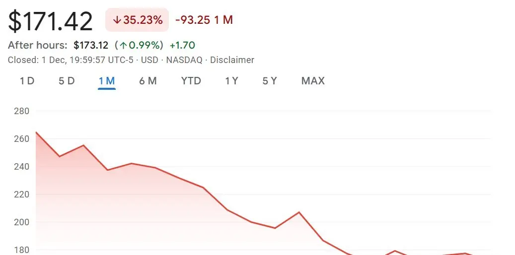 Данные Google Finance показали, что Strategy, крупнейший DAT сектора, упал на 35,23% за месяц, снизившись с $264,67 3 ноября до $171,42 на момент написания.