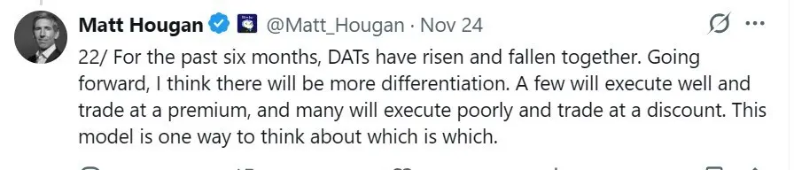 Главный инвестиционный директор Bitwise Мэтт Хоуган сказал, что последние шесть месяцев показали, что DAT обычно движутся синхронно, поднимаясь и падая вместе.