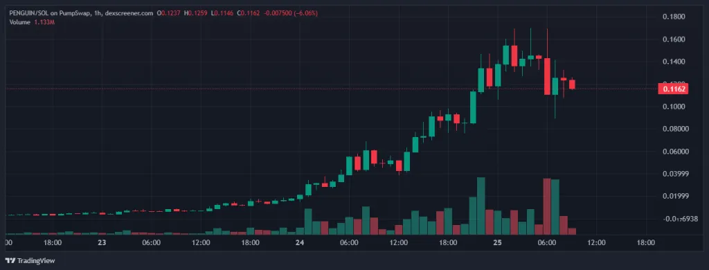 Аналитик Lookonchain обратили внимание на пользователя, который потратил 6 SOL (~$867) на покупку 16,5 млн PENGUIN, а затем продал все токены за 6,12 SOL (~$886). На момент публикации исследователей эти монеты оценивались в $1,4 млн.