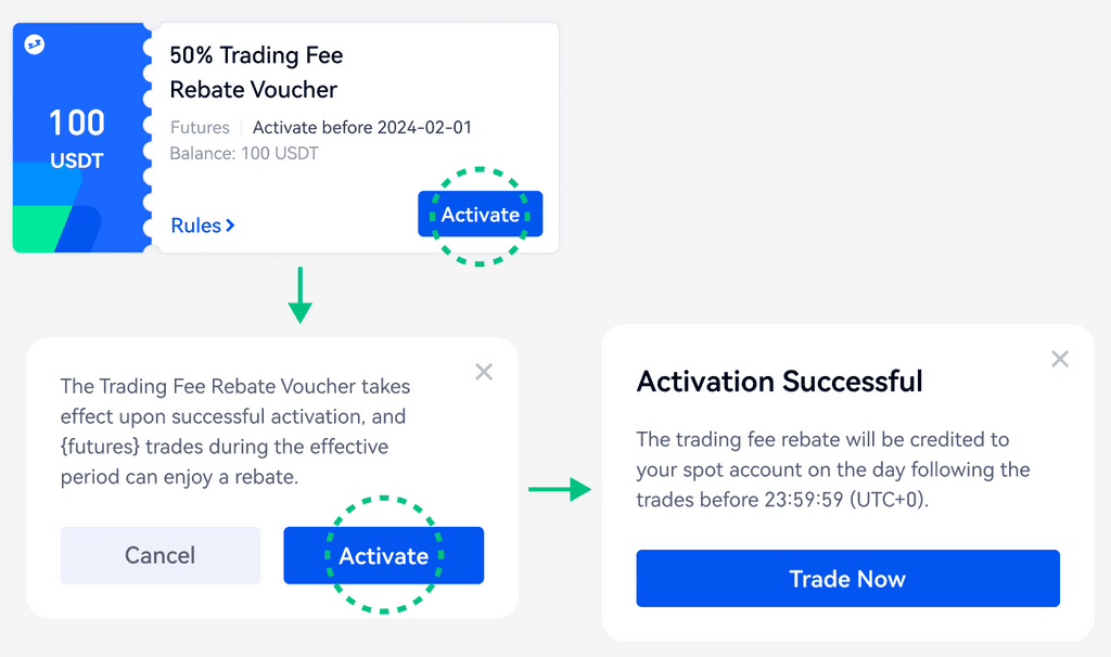 Not: Her bir İşlem Ücreti İndirim Kuponunun indirim yüzdesi, indirim bakiyesi, geçerli piyasa ve geçerlilik süresi vardır. İndirim yüzdesine göre yalnızca uygun işlem ücretleri iade edilecektir ve her bir iadenin maksimum tutarı kuponun bakiyesidir.kupon etkinleştirildiğinde, ilk indirim, etkinleştirme işleminden o gün 23:59:59'a (UTC + 0) kadar üretilen işlem ücretleri için olacaktır.