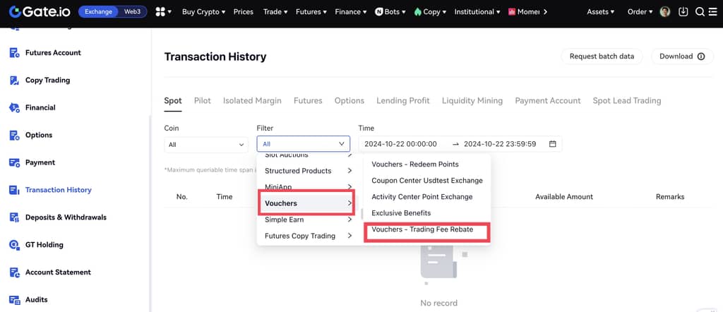 1.【Web】: Gate web sitesi - Varlıklar - İşlem Geçmişi - Spot, ardından indirimli işlem ücretlerini görüntülemek için “Filtre” bölümünden “Kuponlar - İşlem Ücreti İndirimi” ni seçin.