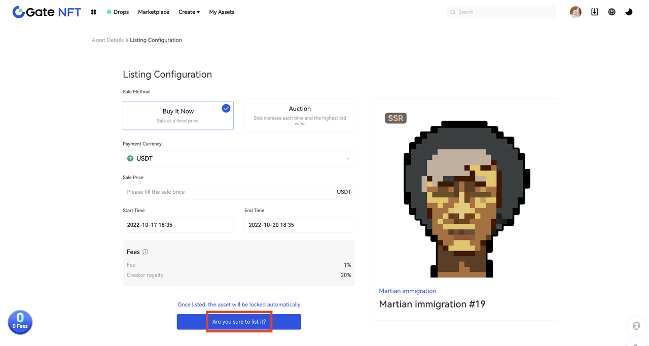 NFT varlığının listeleme yapılandırma sayfasına gidin, Sabit Fiyatlı Satış düğmesine tıklayın, açılır listeden tercih ettiğiniz ödeme para birimini seçin, satış fiyatını girin, listeleme ve listeden çıkarma zamanını ayarlayın ve "Listelemek istediğinizden emin misiniz?" butonuna basın;