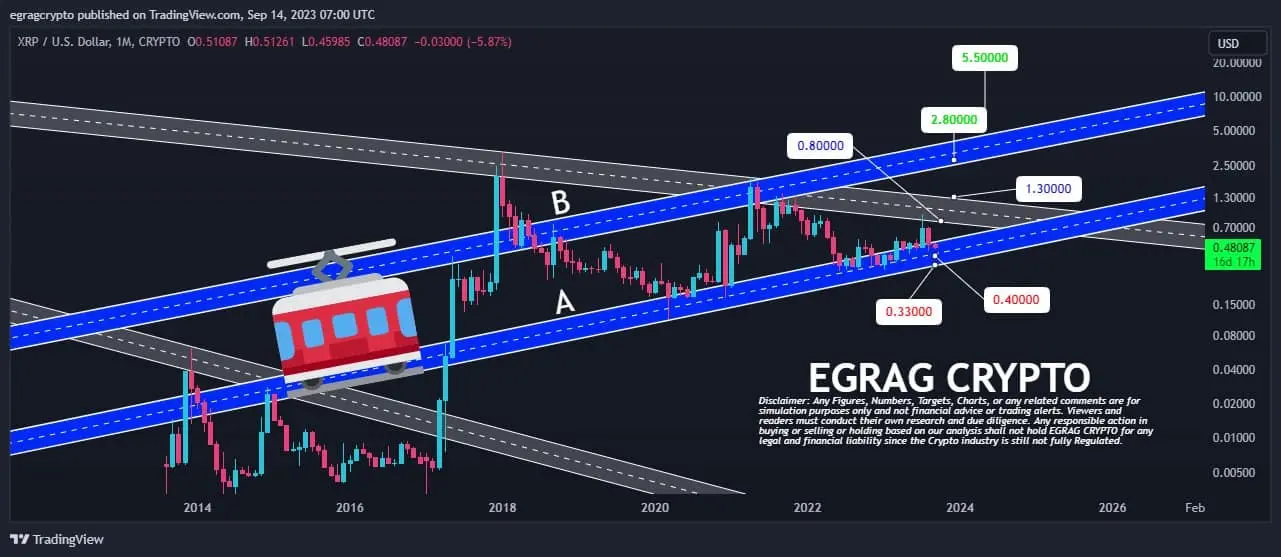 The prognosis outlines a bullish scenario where the main target would be “$2.8 and $5.5, maybe even stretching up to $6-7. These are some serious moonshot goals for XRP.” A potential time frame for this prediction wasn’t provided.e