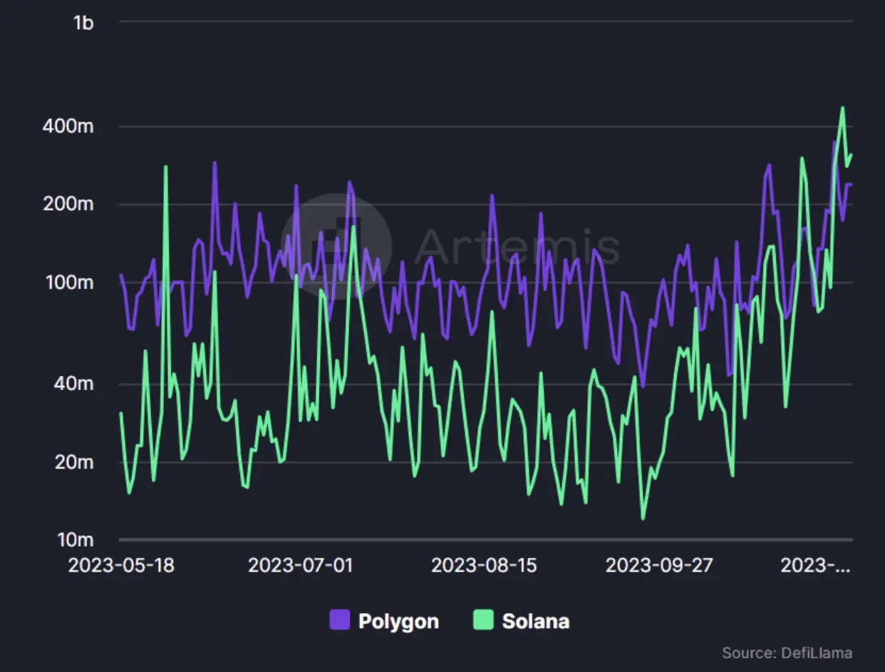 According to the on-chain data platform Artemis, Solana has flipped Polygon in terms of DEXs volume, overtaking the layer-2 by $305M vs. $235M.
