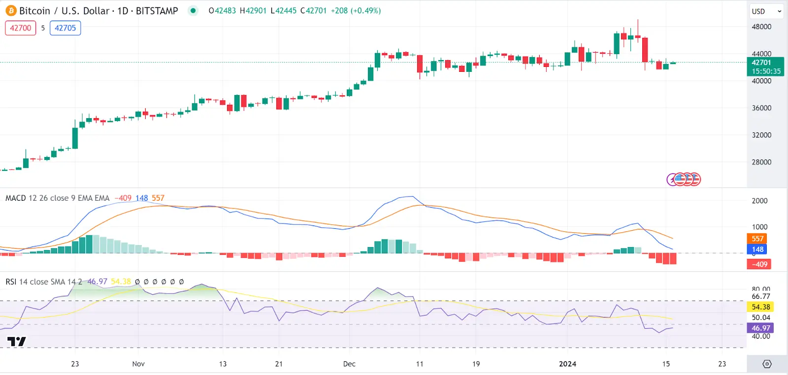 The future price trajectory for Bitcoin now looks bullish, as an in-depth analysis of 24-hour BTC/USD charts reveals. The Relative Strength Index indicator moves north as it approaches 50, showing bull action on BTC. The MACD indicator, on the other hand, has flattened its downward trajectory, showing a failing bearish momentum as it now looks to revert toward the green zone.