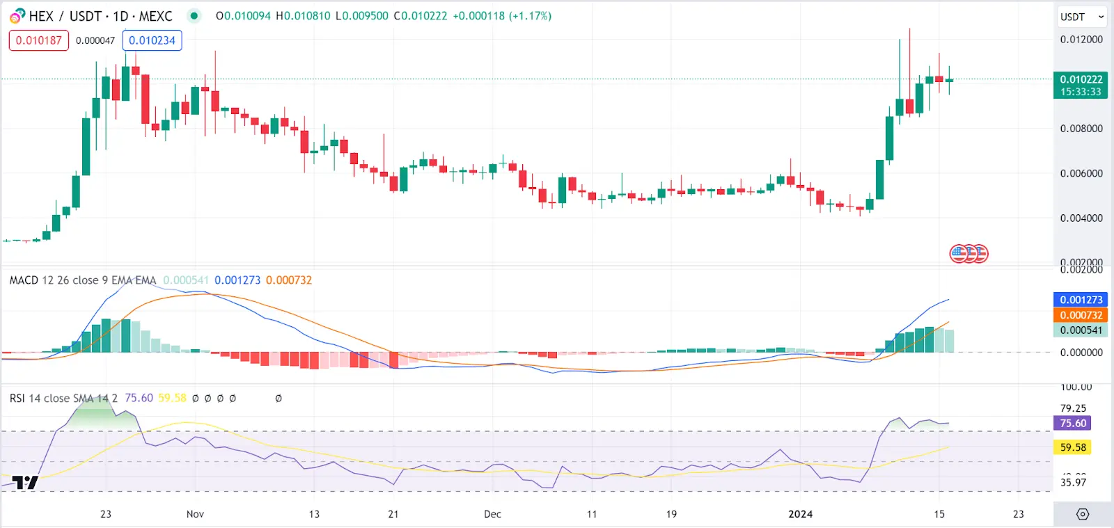 An in-depth analysis of the HEX/USDT charts shows the possibility of a correction in the short term on the HEX price, as shown by the Relative Strength Index indicator, which is currently overbought. With this in mind, holders might seek to sell to capitalize on profits made, which might cause selling pressure. On the other hand, the MACD indicator is reverting toward the red zone, backing the bearish prospects for HEX.