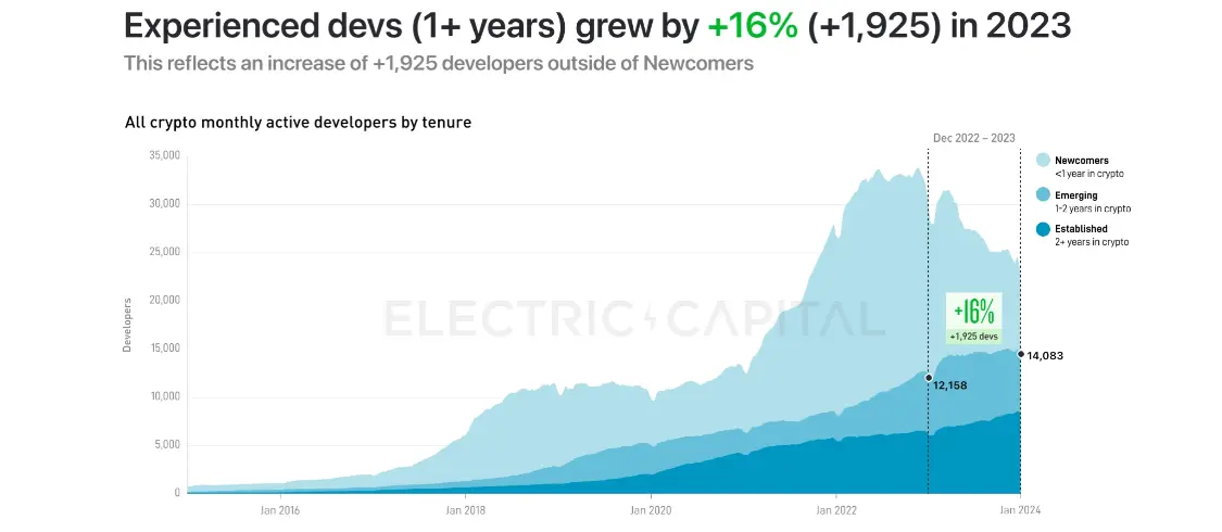 Despite an overall 24% decrease in the number of cryptocurrency developers, the report highlights a notable surge in a core group of experienced developers with over two years of experience in the field. Those with a crypto background exceeding 1 year also experienced a notable 16% year-over-year growth, constituting a substantial 63% of the total monthly active developers.