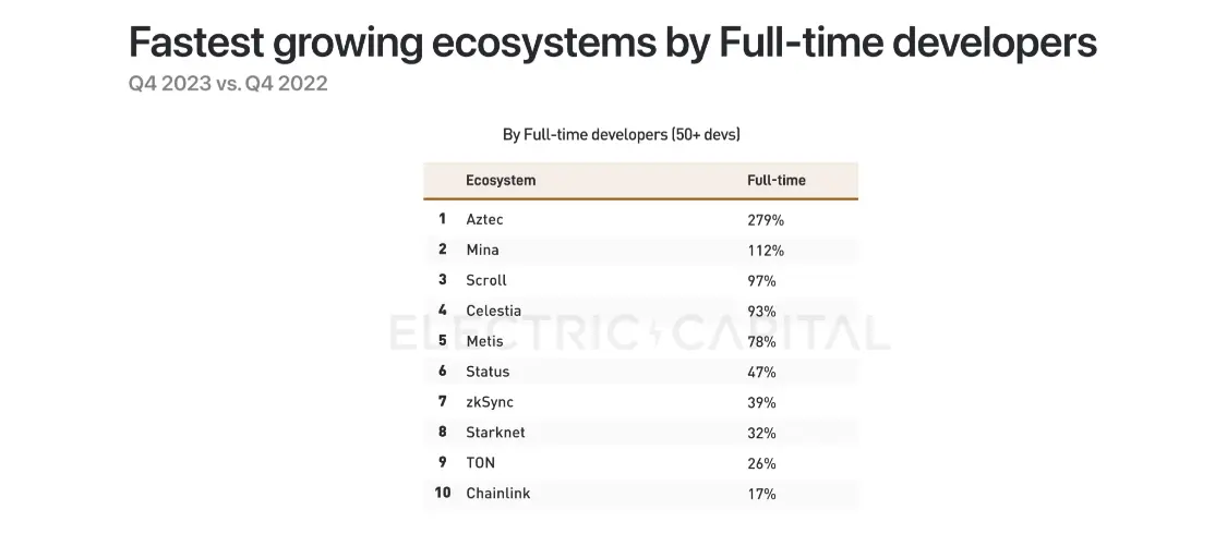 The report also categorizes ecos based on full-time developers, emphasizing projects that have garnered dedicated and consistent developer support. The top ten in this category are Aztec, Mina, Scroll, Celestia, Metis, Status, zkSync, Starknet, TON, and Chainlink.