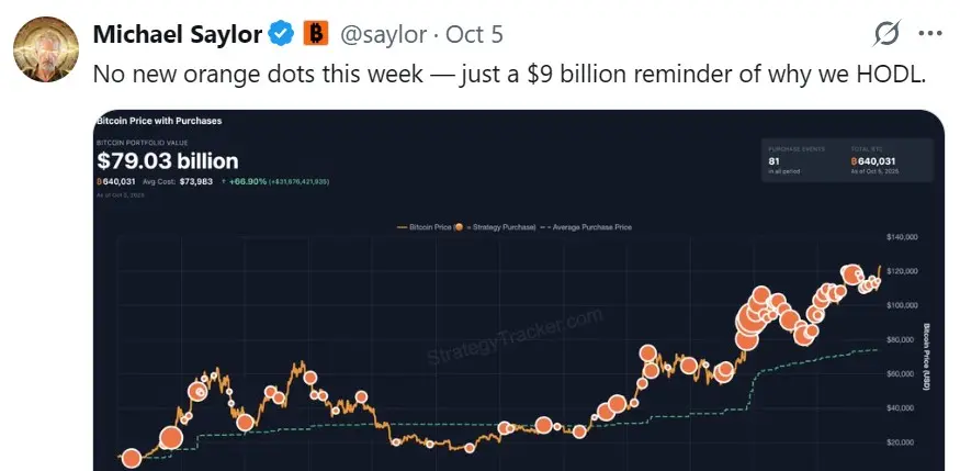 Saylor, şirketin getirilerini vurguladığını, yeni bir Bitcoin alımının yerine geçtiğini söyledi. "Bu hafta yeni turuncu noktalar yok --- sadece $9 milyar HODL nedenimizi hatırlatıyor," Saylor, turuncu noktaların şirketin Bitcoin alımlarını temsil ettiği bir grafik paylaşarak söyledi.