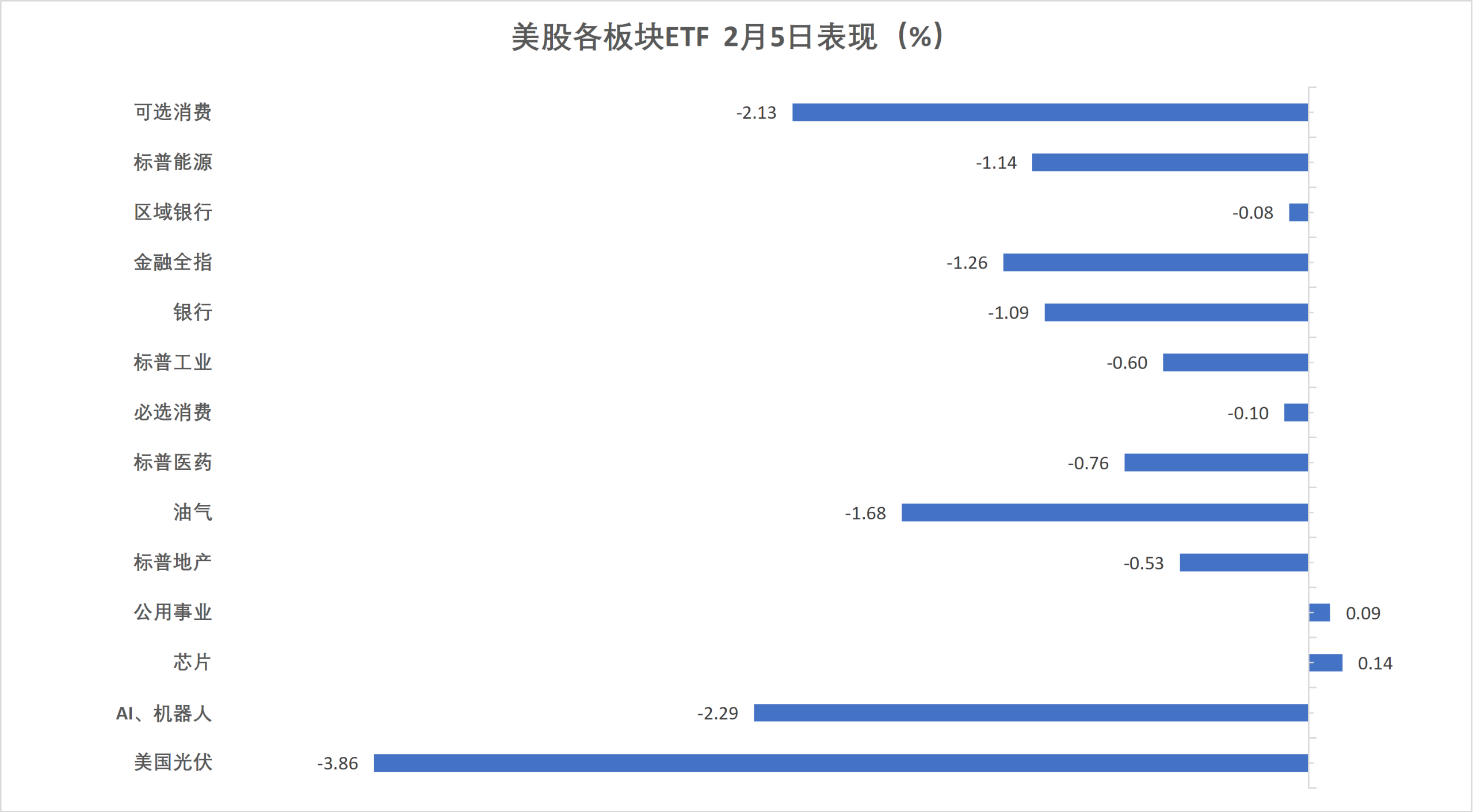 The three major US stock indices all declined over 1%, with small-cap stocks leading the decline; the Russell 2000 fell 1.8%. Of the 11 main sectors in the S&P, 9 declined, with software ETF down 5%. Oracle dropped nearly 7%, Microsoft fell nearly 5%. Amazon’s earnings report caused a 10% drop. The China concept stock index rose against the trend, with Baidu up 0.73%, Meituan up over 2%, and Dingdong Maicai down 15%.