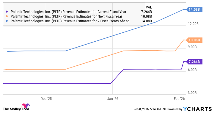The good news for investors is that Palantir anticipates that its outstanding growth will continue. The company has guided for almost $7.2 billion in revenue for 2026, which would be a 61% jump over last year. However, Palantir could easily coast past that estimate.