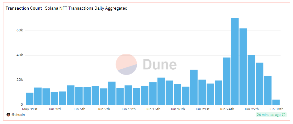 The increasing level of transaction activity is matched by a corresponding surge in transaction volume, highlighting the growing enthusiasm and involvement in Solana’s NFT marketplace.