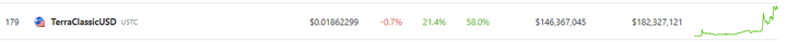 Data from crypto market tracker Coingecko shows USTC trading at $0.0186, notching a 24-hour increase in value of 21.4%. In the last seven days, the stablecoin registered an impressive 58% rally, causing its trading volume to balloon to a solid 409%.