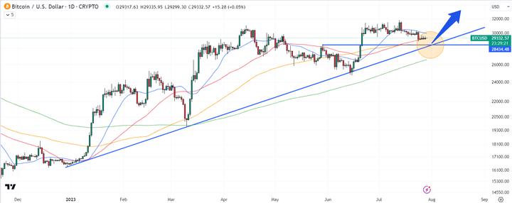 The world’s largest cryptocurrency by market capitalization has been holding above its 50-Day Moving Average (DMA) (also at $29,300) this week.