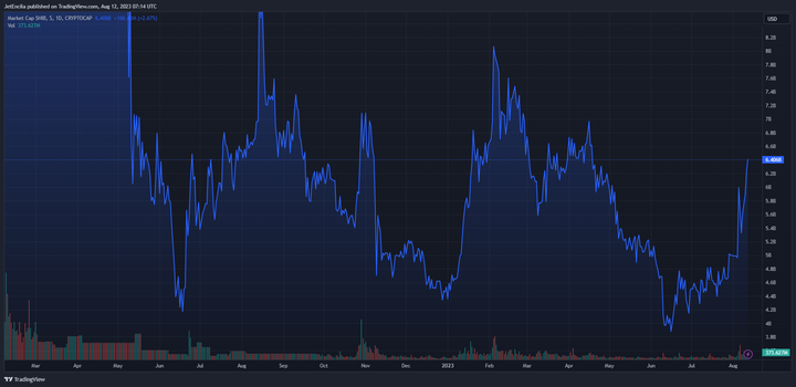 The market capitalization of Shiba Inu is currently $6.4 billion. Chart: TradingView.com