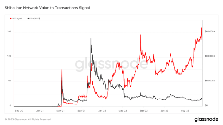 Analyzing the Network Value to Transactions (NVT) signal provides further insights into SHIB’s current state. According to Glassnode data cited by a price analysis, the NVT metric has surged to 170.52.