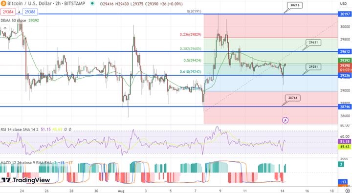 Bitcoin Price Chart - Source: TradingviewBitcoin has touched a significant Fibonacci retracement level of 61.8%, marking $29,200.