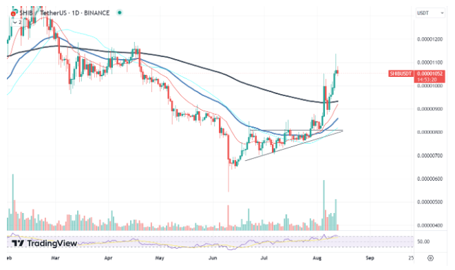 Bolstered by a robust 28% surge in price over the past eight days, SHIB is now at the precipice of what traders refer to as a “Golden Cross,” a technical pattern that could herald further significant gains.
