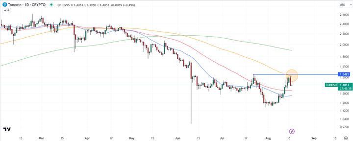 The cryptocurrency, which powers a layer 1 blockchain that was initially developed by the same team behind hugely popular encrypted messaging app Telegram, tried and failed to break above resistance at $1.52 in the form of the July highs and 100DMA.