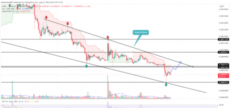 Mid-August proved to be a pivotal juncture for LUNC as aggressive selling surged, triggering a precipitous plunge from $0.0000658 to $0.0000523. This swift and significant 34% drop led to a critical retest of the support trendline intrinsic to the falling channel pattern