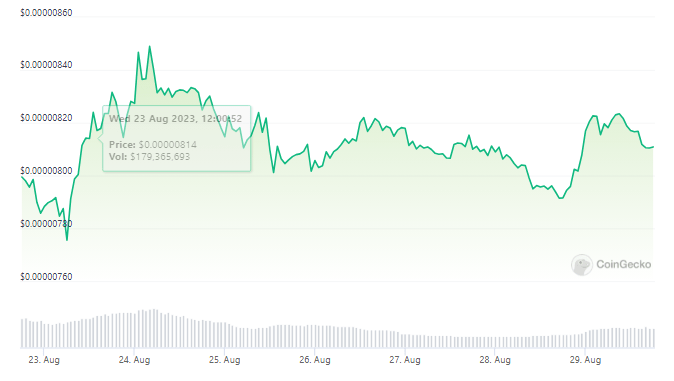 As of the latest data, the current SHIB price stands at $0.00000814 according to CoinGecko, indicating a 2.1% rally over the past 24 hours. In the span of seven days, SHIB has managed to accrue gains of 3.4%. These numbers, against the backdrop of recent market turbulence, hint at a certain level of resilience within the SHIB token.