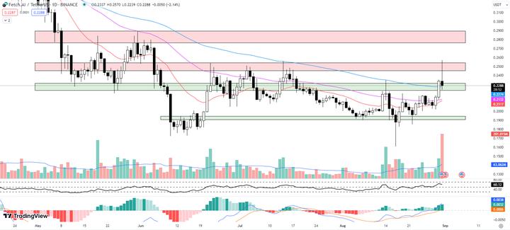 FET is now retesting the 100-day EMA for potential support. The immediate resistance zone for FET is between $0.2453 and $0.2543.