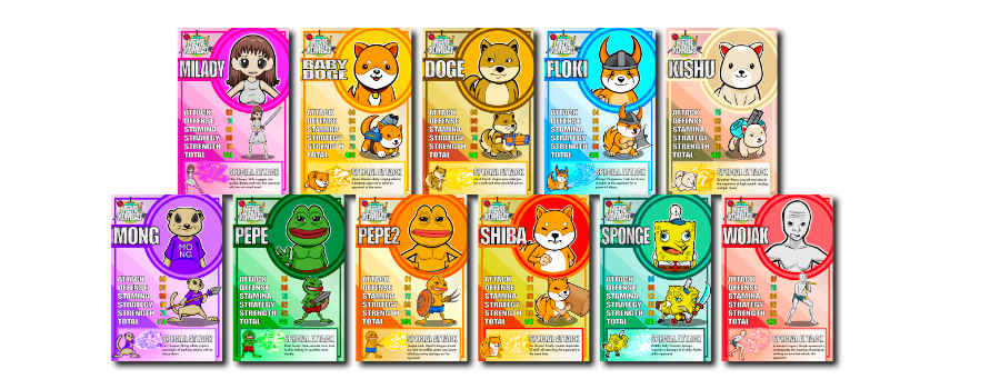 There are 11 meme characters available to battle with in Season 1: Milady, Baby Doge, Doge, Floki, Kishu, Mong, Pepe, Pepe2, Shiba, Sponge and Wojak.