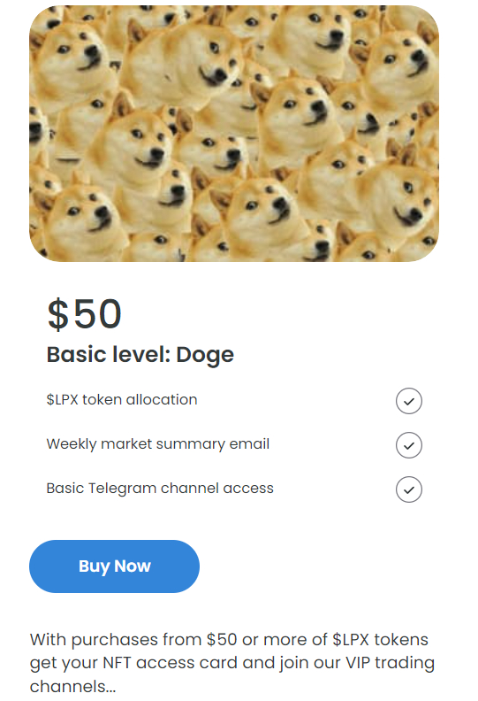 For a $50 investment, one can obtain the Doge Pass, which includes an allocation of the platform’s native $LPX tokens, a weekly market summary email, and access to a basic Telegram channel. This is considered the entry-level pass, offering the most basic features to users.