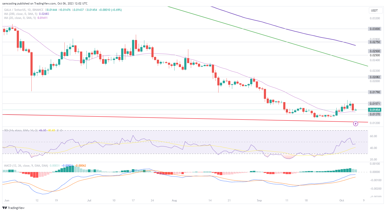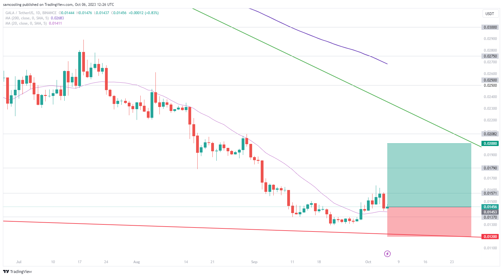 TradingView / GALA USDTPrice action is now fighting to consolidate above the 20DMA at the $0.0145 level.