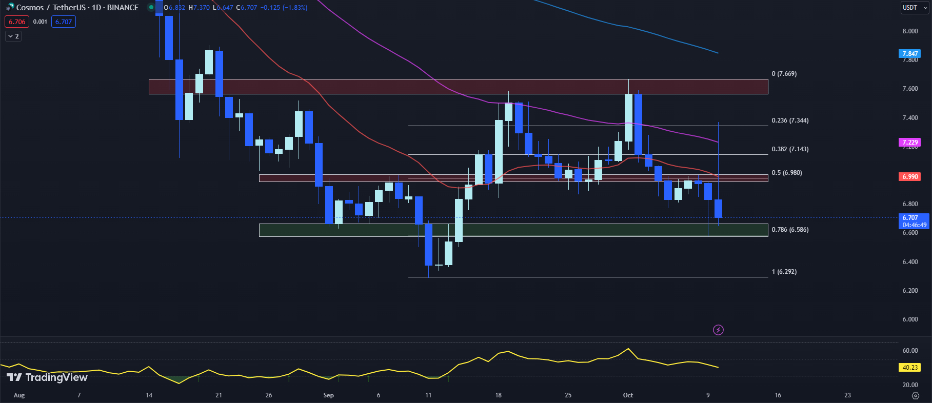 Source: TradingView / ATOMUSDTThe ATOM price has been struggling to regain momentum after its recent selloff. ATOM is currently trading at $6.707, down 1.83% on the day. With the price well below key EMA levels, ATOM remains in a bearish state according to the EMAs.