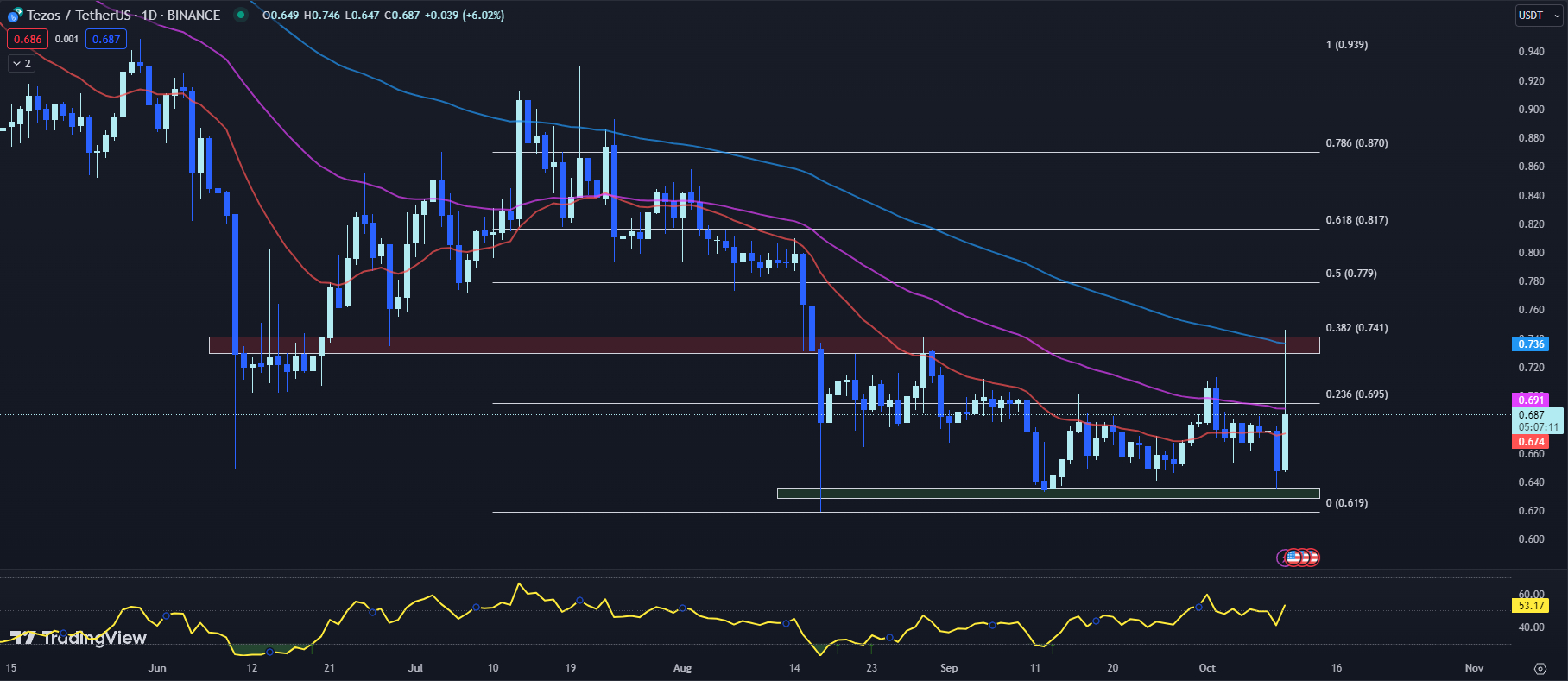 Source: TradingView / XTZUSDTThe XTZ price has seen a slight uptick today, gaining 6.02% to trade around $0.687. However, despite testing the 100-day EMA earlier, XTZ has returned to the trading range it has been stuck in for over 50 days now.