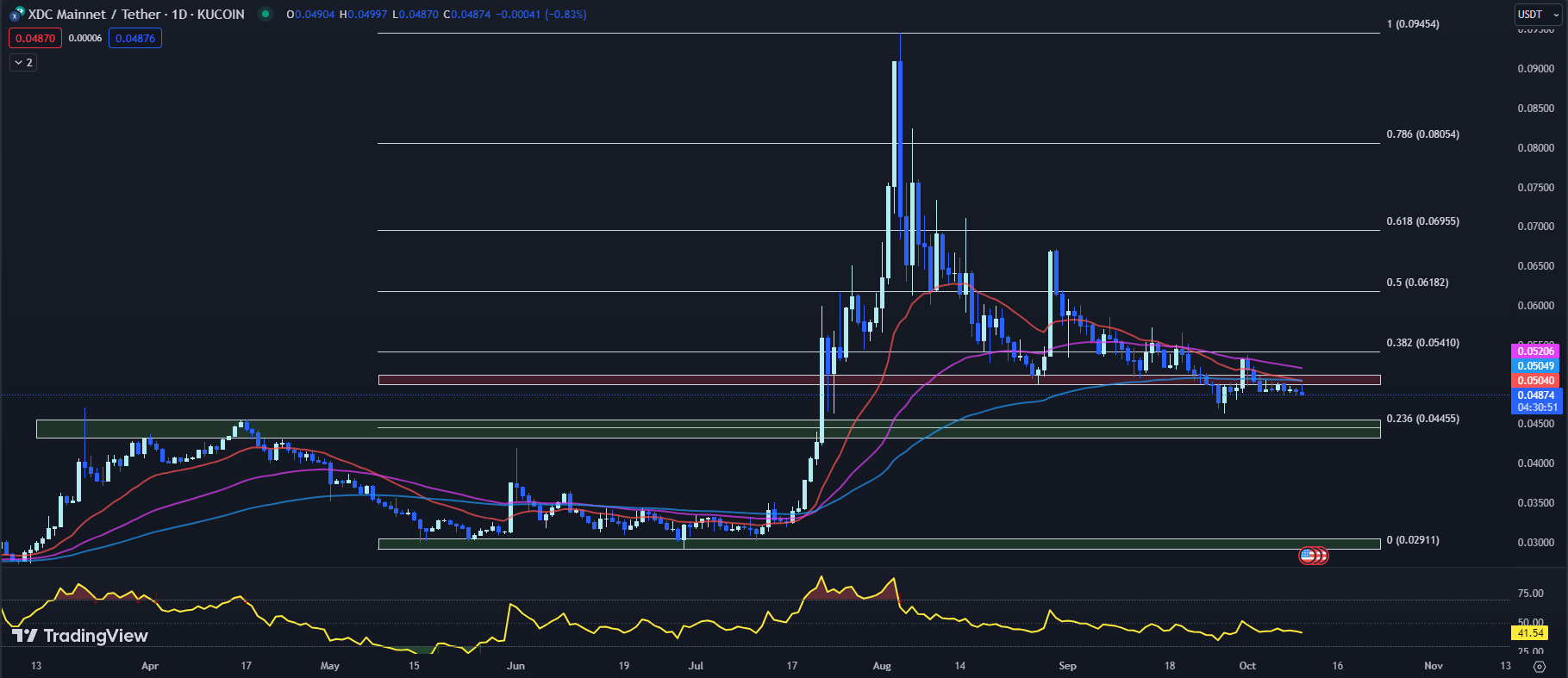 Source: TradingView / XDCUSDTThe XDC price continues to face selling pressure, with the cryptocurrency down 0.83% so far today to trade around $0.04874. This extends the slow bleed lower that XDC has experienced for much of the past month, with the coin now down 8.42% so far in October.