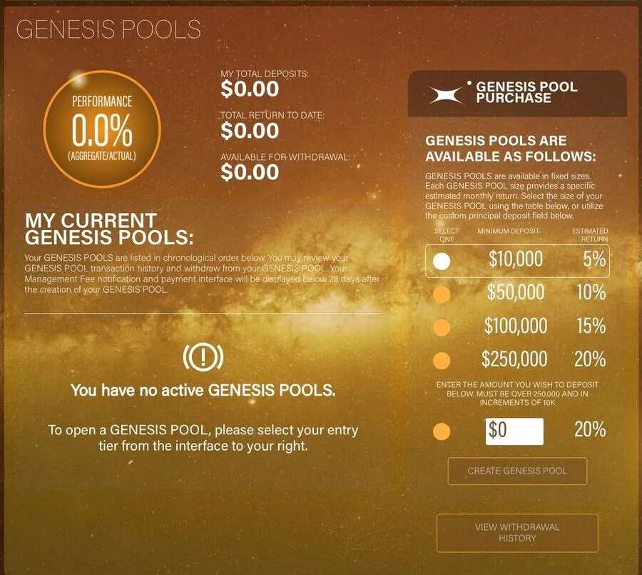 The platform is designed for individual and large-scale investors with options like Genesis Accounts and Pools