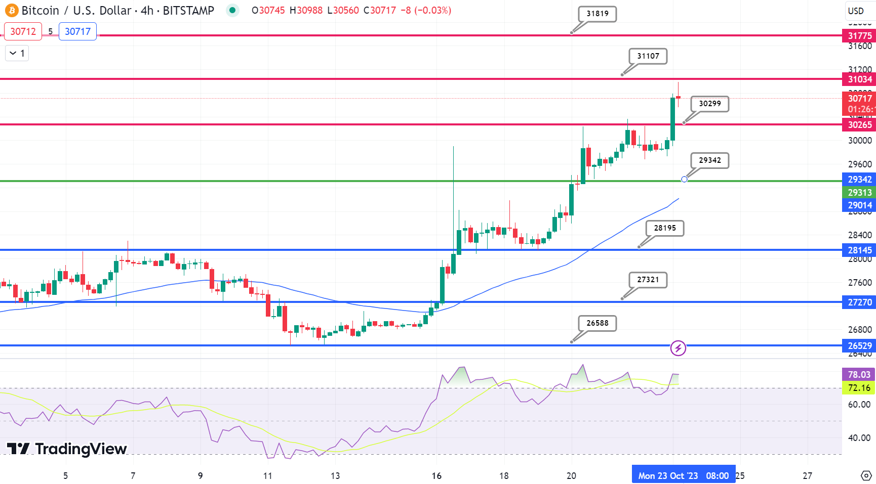 When analyzing the 4-hour chart for Bitcoin, several pivotal price levels emerge. The pivot point is $29,208, and the immediate resistance is $31,207