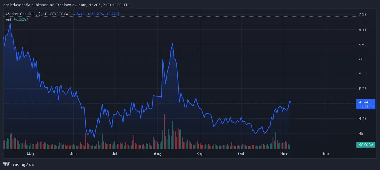 SHIB market cap currently at $4.839 billion. Chart: TradingView.com