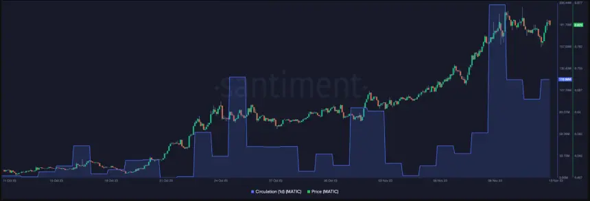 Based on data provided by the analytics platform Santiment, it has been seen that large-scale investors, commonly referred to as whales, with holdings ranging from 100,000 to 10 million MATIC tokens, have accumulated an excess of 42 million more tokens during the latter part of October.