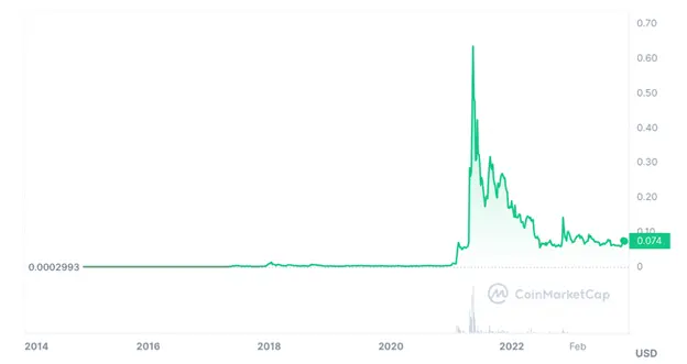 Dogecoin holds a $10 billion market cap, priced at just under $0.08. This is -89% from its May 2021 all-time high of $0.7376, giving room for almost a 10x from its current price.
