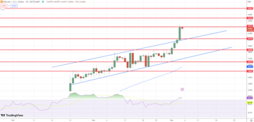 The observed chart pattern reveals an upward channel that has been the playground for Bitcoin’s price action in recent weeks. The cryptocurrency has just broken above this channel, which, under normal circumstances, would indicate a strong bullish momentum. However, the overbought RSI adds a layer of caution to this outlook, as it could presage a short-term pullback before any further ascension.