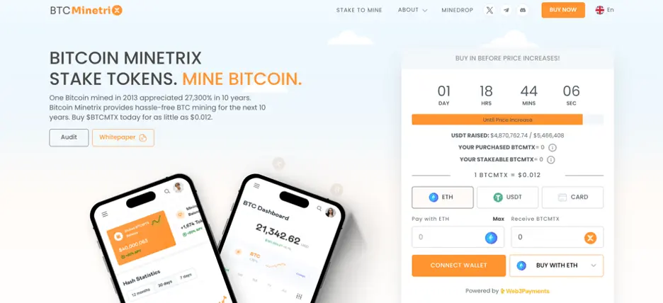With Bitcoin Minetrix, users can cloud mine Bitcoin by staking $BTCMTX on its Ethereum-based platform.