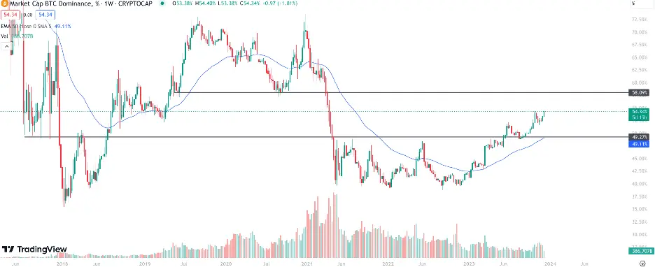 Bitcoin’s rally has propelled its market share, with Bitcoin dominance climbing from 40% in October 2022 to 54% today.
