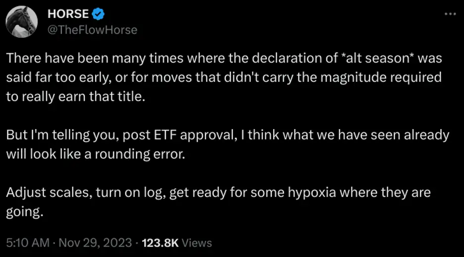 Analyst HORSE also forecasts that a parabolic altcoin season will occur following the Bitcoin ETF approvals. The SEC is expected to make decisions on the ETFs in January, with market consensus being that they will be approved.