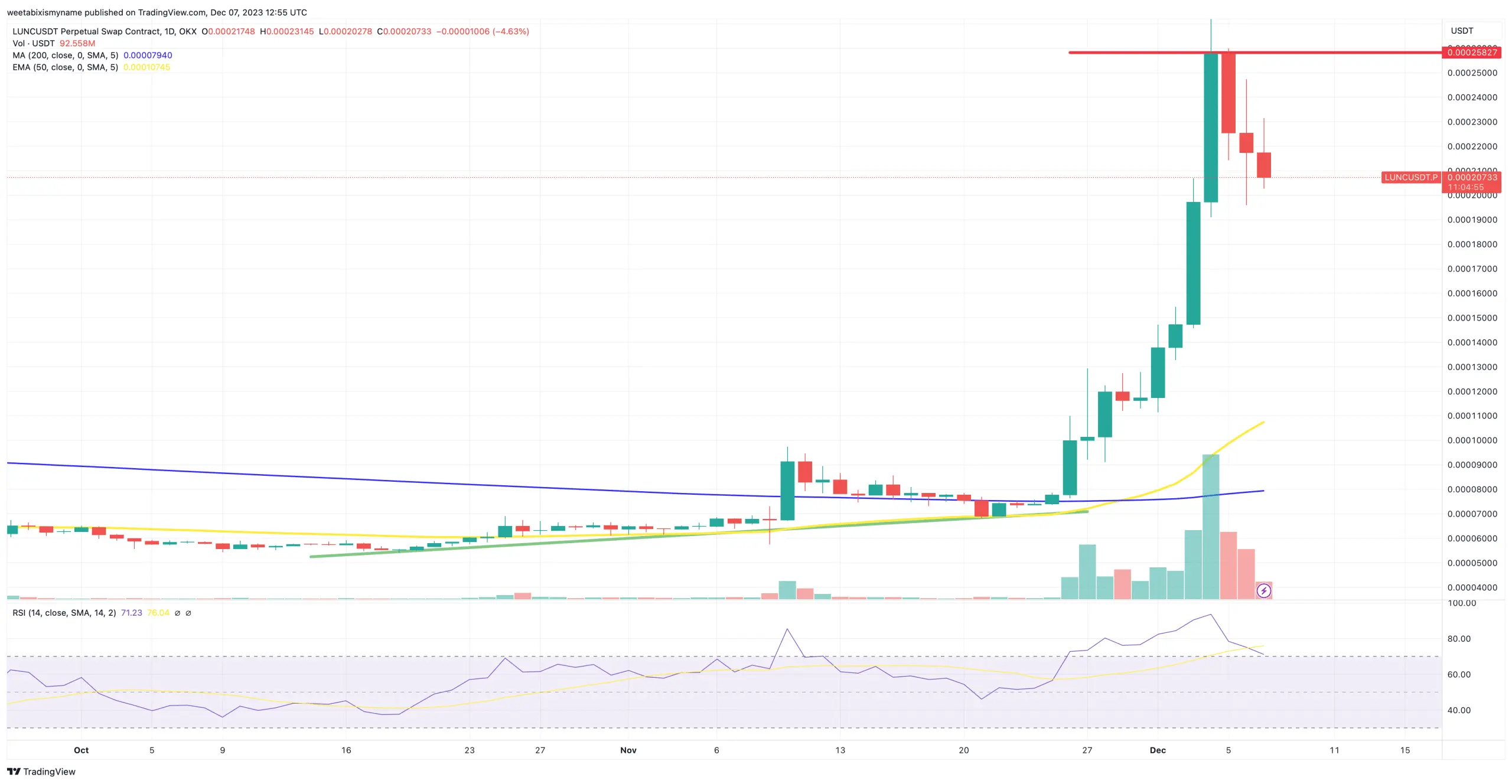 Such a fall has done little to dent LUNC’s recent progress, however, with the altcoin having risen by 80% in a week and by 213% in the last month.