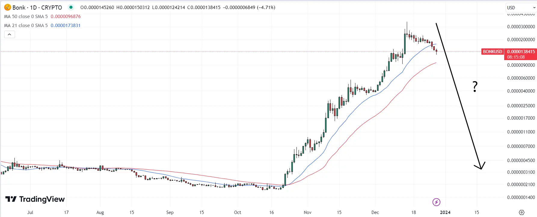 Bonk! Chart / Source: TradingViewThe Bonk! ($BONK) pullback continues to gather pace, with the $BONK price having now fallen more than 60% from the record highs it hit earlier in the month near $0.000035 per token.