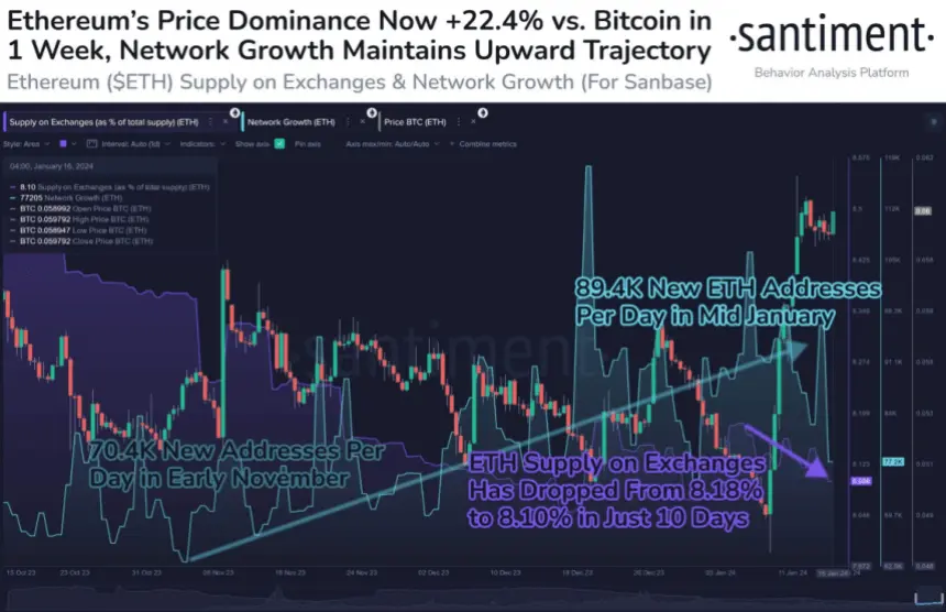 Recent data from Santiment vividly illustrates Ethereum’s ascendancy. The platform’s price dominance, reflecting its market share in comparison to all other cryptocurrencies, has witnessed a remarkable surge of 22.4% within a mere week.