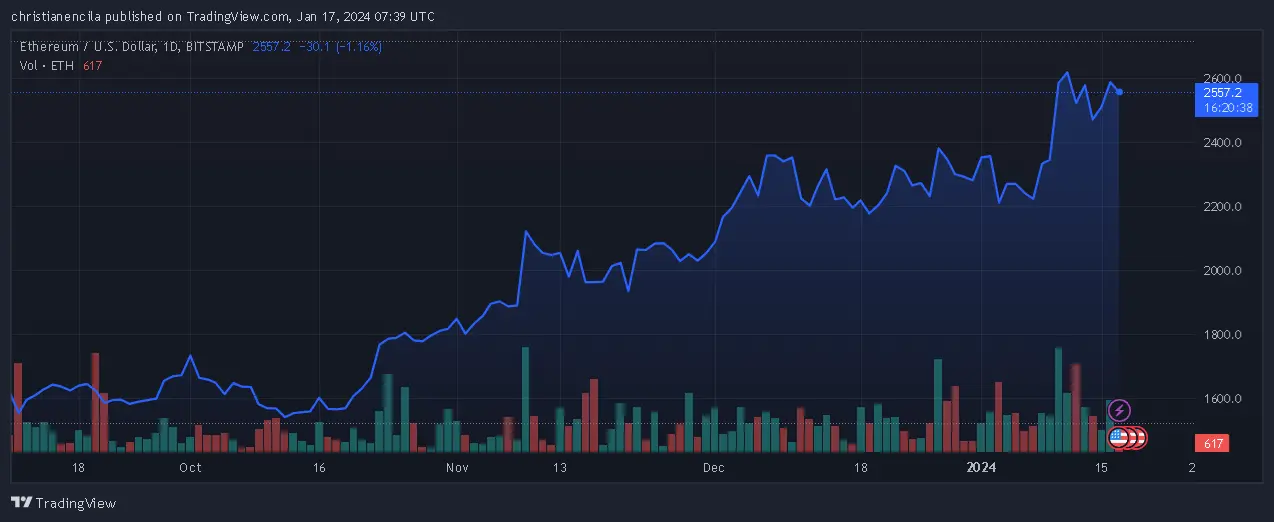 Ethereum currently trading at $2,556 on the daily chart: TradingView.com