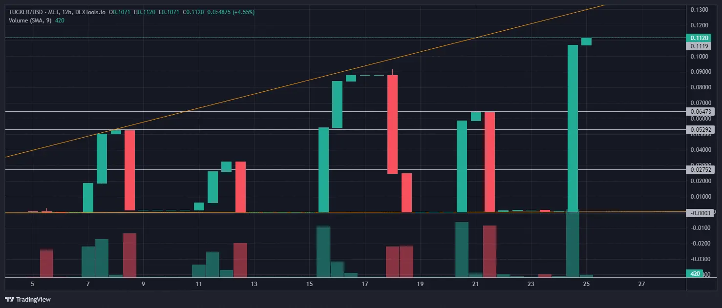 As price action remains high, Tucker Token is currently trading at a market price of $0.11339623 (representing a 24-hour change of +19,062%).