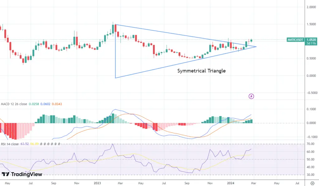 Symmetrical Triangle Breakout on Polygon Weekly Charts, Feb 2024Upon the formation, it seems that Polygon’s price might break $1.5 and even go toward $1.7. If the overall markets remain euphoric, the price might even cross $2.