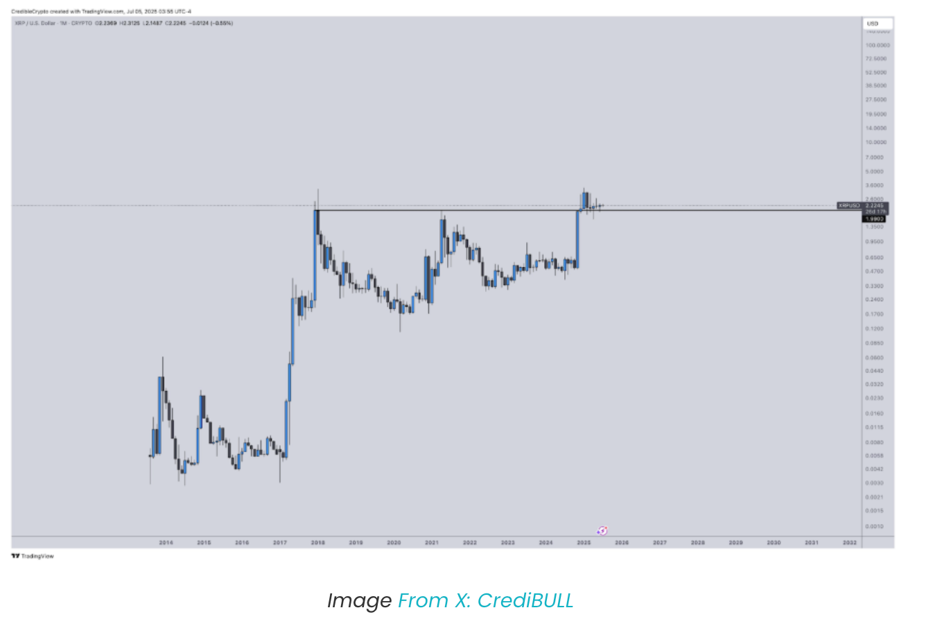 Він зазначив, що таке тривале коливання, особливо після потужного прориву позначки 0,50 доларів наприкінці 2024 року, вказує на те, що XRP готується до подальшого прориву. Варто зазначити, що його місячний K-ліст показує, що група щільних місячних K-лістів коливається вище 2,00 доларів. За даними CrediBULL, ця структура є однією з найясніших у сфері криптоактивів, поступаючись лише біткоїну.
