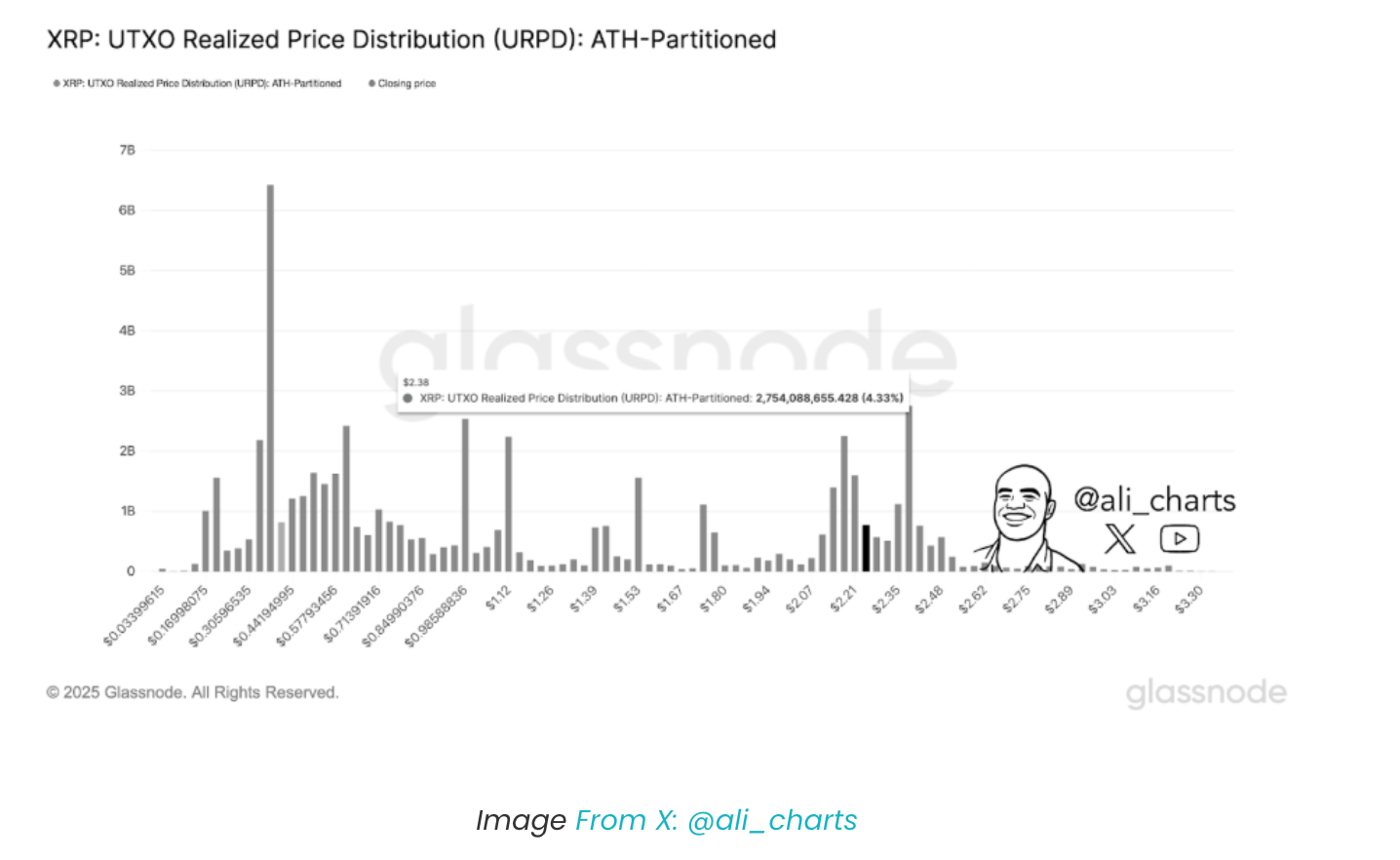Технічний аналітик Ali Martinez вказав, що 2.38 долара є наступним основним рівнем опору, що ще більше посилює довіру до висновку про зростання. Ця точка зору базується на даних про розподіл фактичних цін UTXO від Glassnode (URPD), які показують, що велика кількість обсягів XRP зосереджена на цьому ціновому рівні. Якщо XRP зможе прорвати цю зону з потужним обсягом торгів, це не лише дозволить подолати сильний рівень опору, але й викличе хвилю попиту на покупки та сильне відновлення.