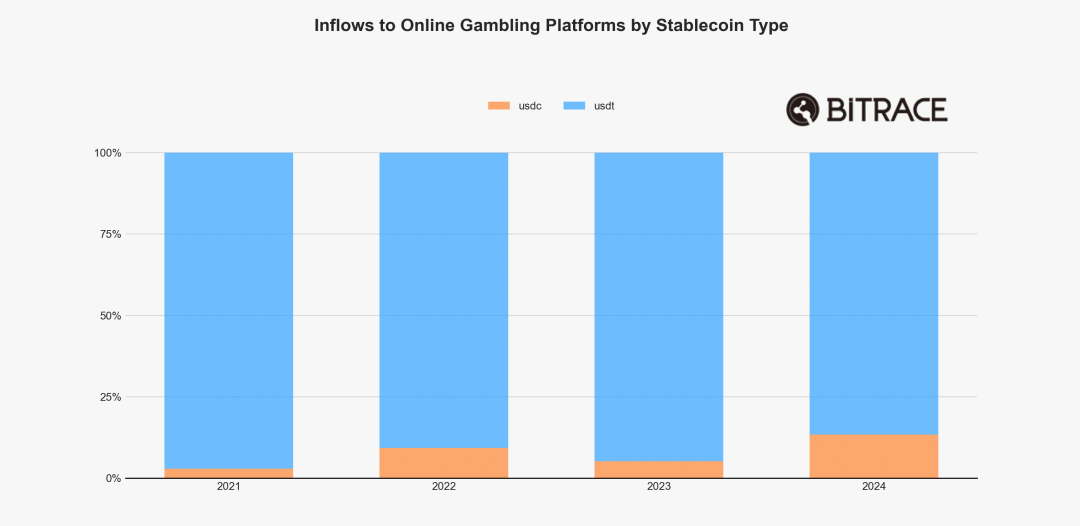 Статистика типів стабільних монет, які використовуються на платформах азартних ігор, показує, що частка USDC у 2024 році значно зросла і становить 13,36%, що значно вище, ніж 5,22% у 2023 році. Це свідчить про те, що з ростом ринкової капіталізації USDC, його використання в сфері онлайн-азартних ігор також суттєво зросло, незважаючи на те, що він випускається та регулюється відповідними організаціями.